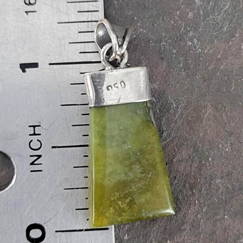 Beautiful polished Serpentine from Peru cut into the trapezoidal Shape, found among the ancient architecture of the stone windows and doors of the Incas. The snake curls up to the bale, an archetype of the healer throughout many cultures, the one who teaches us to shed our personal past the way she sheds her skin. The silver work is carefully crafted by the Q’ero silversmiths of Peru. The length is 1 1/4" and the bail opening is 3mm wide. A single round of Serpentine is set within the coils of the snake!