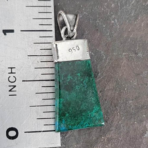 A beautiful Pendant handmade by the artisans of Peru. The Natural Peruvian Turquoise (Chrysocolla) is set open, polished and smooth, in the sacred shape found in the windows that are carefully aligned with surrounding mountains and stars found throughout Machu Pichu and other ancient Incan sites. The hand worked silver at the top of the stone is in the shape of a hummingbird. The Royal Hummingbird is sacred to the people of the Andes, The archetype of the North, it was thought to be the symbol of joy and reminded us to enjoy “the sweet nectar of life”. The bale’s width is 3mm and the pendant suspends 1.15” in length.