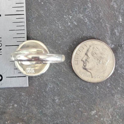 A Beautiful ring handmade by the artisans of Peru.  The vibrant Purple Spiny Oyster has been carefully hand cut and inlaid into the sacred spiral pattern of "Pachamama" Mother earth! The center is comprised of a small circle of Yellow Mother of Earl Shell. The total length of the face of the ring is 15mm. The 3mm silver band has been left open under the face of the ring to allow gentle resizing up to one ring size larger. It will come sized as a US size 8.