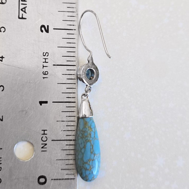 One of a Kind Sample straight from the designer’s private creations with their team in India! These earrings are comprised of a beautiful drops of Compressed Turquoise and faceted rounds of Blue Topaz! They measure2 ¼” from the ear. Designed by Marianna and Richard and crafted by the Artisans of India!