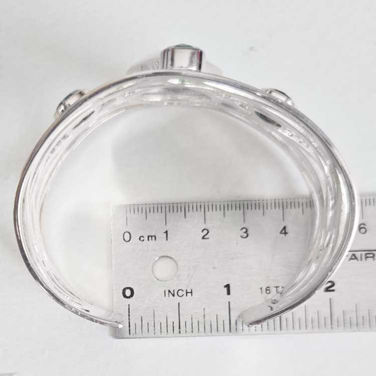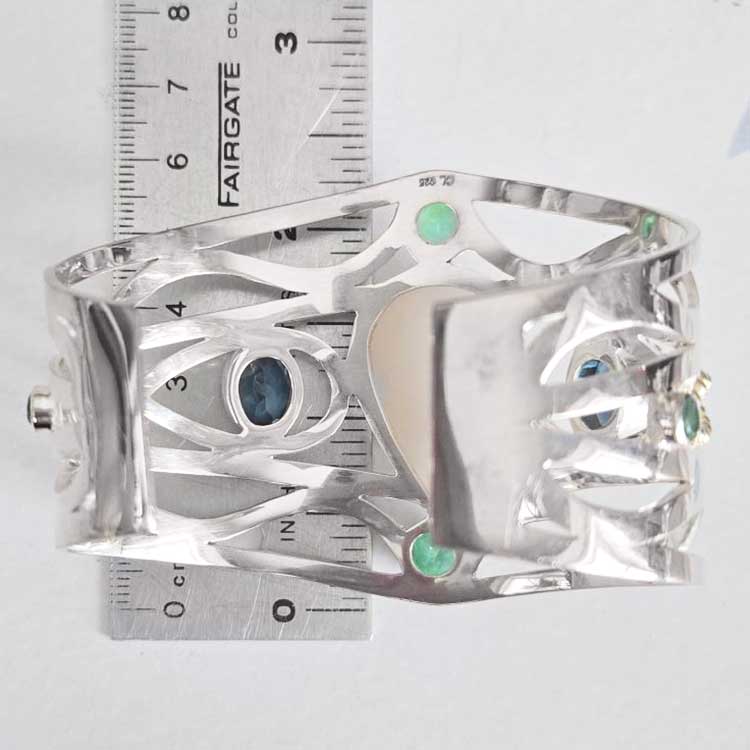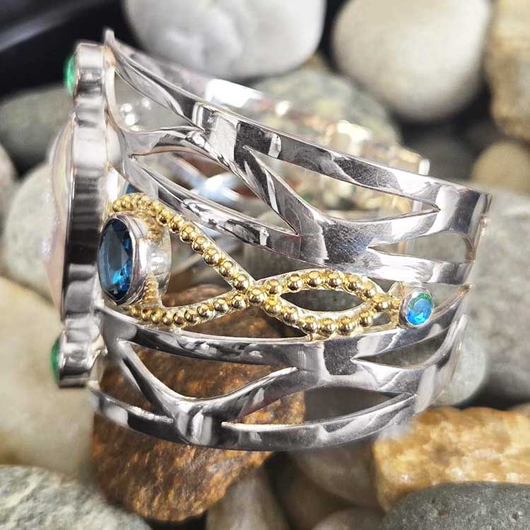 A sparkling and luminescent Opalized Druzy (22x30mm pear) marks the center of this large distinguished cuff bracelet! Measuring 2 ¼” wide this magnificent piece also features two London Blue Quartz ovals (10x12mm), four Caribbean Quartz rounds (two 8mm and two 5mm). Vermeil beads add dimension and add the perfect accent to the composition! The cuff measure 5” with a 1” gap. 2.25