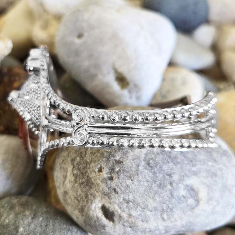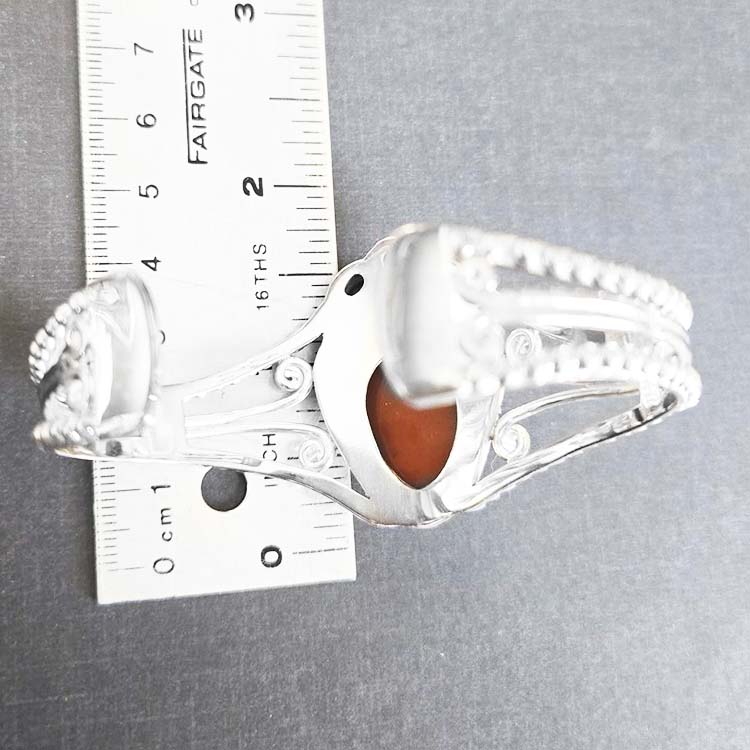 This striking Goddess cuff bracelet is an eye catching piece of wearable art! The focal point is a hand crafted Red Jasper Goddess wearing a ornate and gemstone adorned headdress! Gemstones include Citrine, Garnet, and Black Star Diopside! This cuff was designed by Marianna and Richard and handmade by Balinese Artisans. The length is 6.5" with a 1" gap. the width is 1.5".