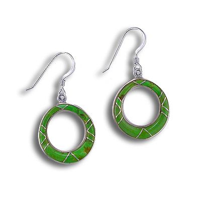 These lovely dangle earrings are simple yet display intricate and masterful silver work. Petite sections of Gaspeite inlay form a charming pattern making these hoops an accessory that is able to go from casual to dressy. The total length is 1 1/2".