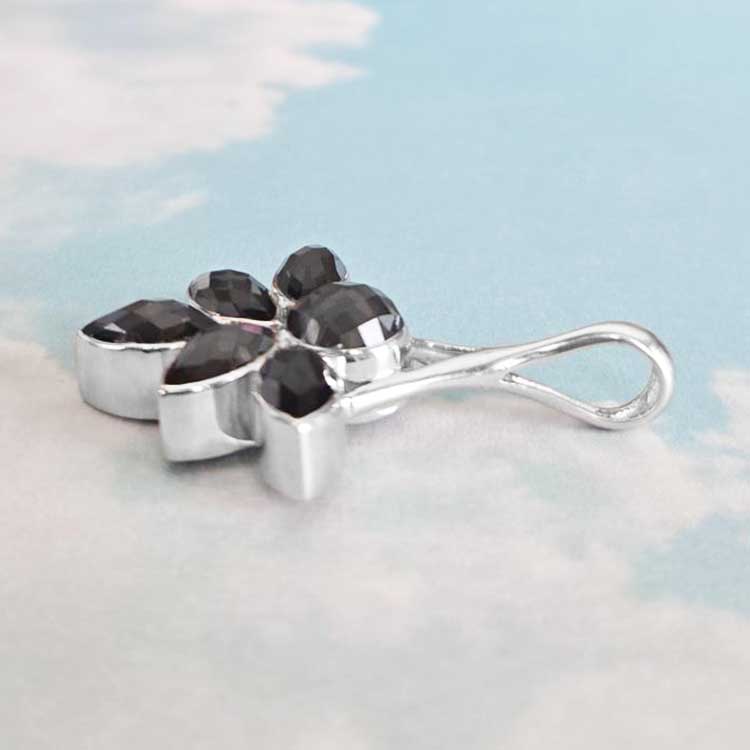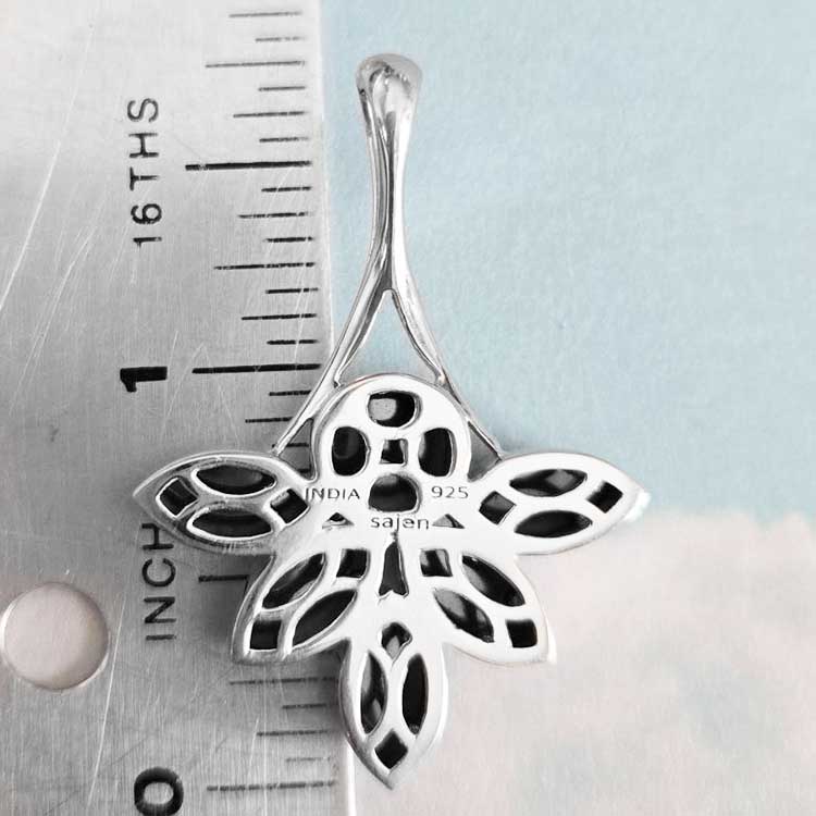 One of a Kind Sample straight from the designer’s private creations with their team in India! This simply elegant piece features five Black Titanium Backed Quartz marquis and one round! The entire back of the piece is comprised of intricate silver work reminiscent of the tapestries found in India! Measuring 1 1/2” long this pendant was designed by Marianna and Richard and crafted by the Artisans of India!