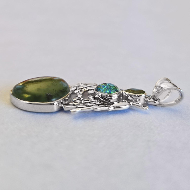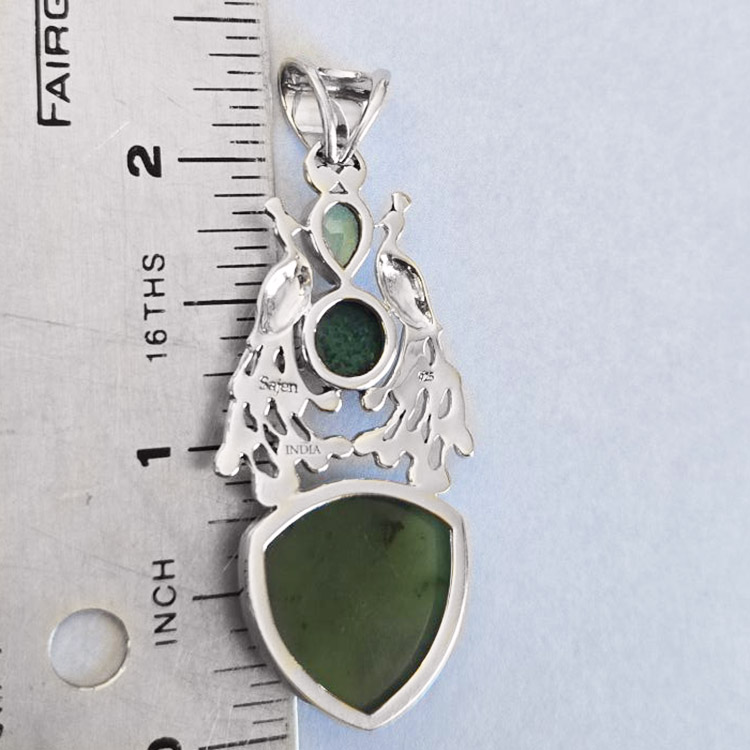 One of a Kind Sample straight from the designer’s private creations with their team in India! The peacock is the national bird of India and symbolizes love, joy and divinity! The accent stones on this piece are (from top to bottom) a Lemon Lime colored quartz, a Green Created Opal Quartz and a Nephrite Jade, which has been known to enhance inner peace! This beauty measures 2 ¼ “long and 1” wide. Designed by Marianna and Richard and crafted by the Artisans of India!