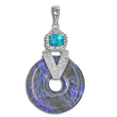 Sterling silver hinged pendant with a large 35mm polished disk of Sodalite and a beautifully matching 13mm faceted rectangle of Rainbow Teal Quartz. The disk is also known as a Pi (a circular stone with a hole in the middle). These stones represent our energy field and the energy of the Universe! The total length of this pendant is 2 3/4".