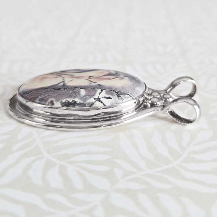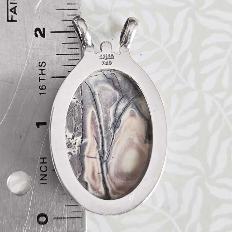 Simple yet elegant Sterling silver pendant with a 30mm Porcelain Jasper stone. This Jasper is known to have gentle and stabilizing energy that will assist in releasing tension! It fosters feelings of safety as well as attracting love! This double bale pendant was designed by Marianna and Richard and handmade by the Artisans of Bali! It measures 2” top to bottom!
