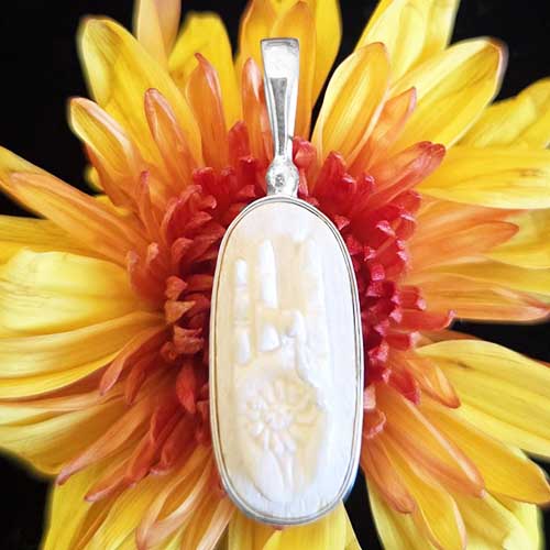 This pendant features a 10x20mm hand carved bovine cattle bone Mudra! This carving is bezel set in 925 Sterling Silver with a simple single bale. Designed by Marianna and Richard and handmade by Balinese Artisans this pendant is 1 1/2" long.
