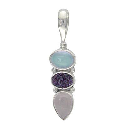 Illumination comes in many forms and expresses reflection of light with incredible variation. Such is the essence of this lovely pendant. Set at the top is an 6x8mm oval titanium backed Moonstone with inner ribbons of color bands. In the center is a 5x7mm oval Caribbean Druzy, with a surface of crystals that glitters at every turn. Finally, a 7x10mm pear of Rose Quartz offers a soft and lustrous glow. Including the 7/16" bail, the total length of this pendant is 1 5/8".